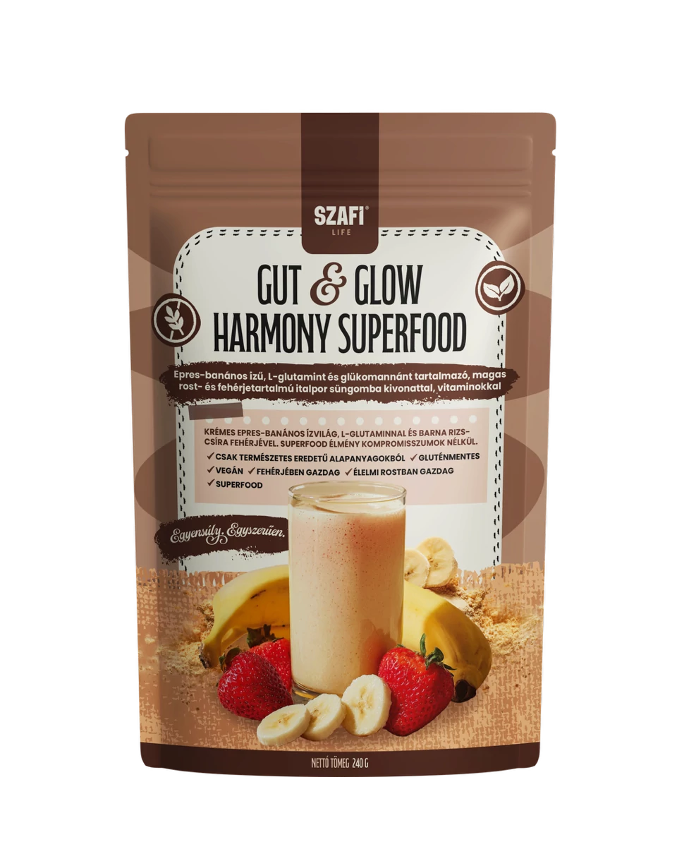 Epres-banános ízű, L-glutamint és glükomannánt tartalmazó, magas rost- és fehérjetartalmú italpor süngomba kivonattal, vitaminokkal és édesítőszerrel